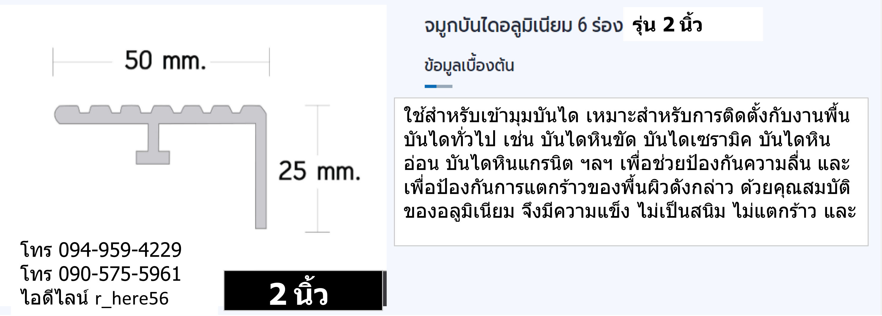 | หมวดหมู่ | จมูกบันไดอลูมิเนียม กว้าง1.5นิ้ว และ 2 นิ้ว |
